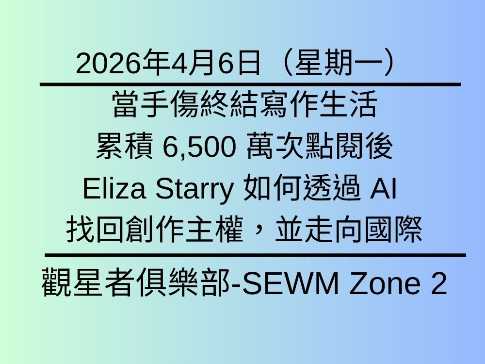 2026年4月6日(星期一) |當手傷終結寫作生活:累積 6,500 萬次點閱後,Eliza Starry 如何透過 AI 找回創作主權,並走向國際 |觀星者俱樂部 (SEWM Zone 2 ) |伊莉莎... -
