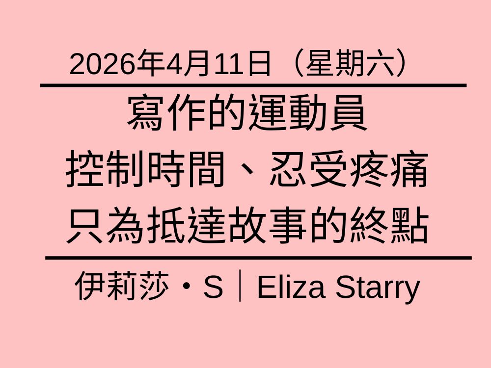 |寫作的運動員:控制時間、忍受疼痛,只為抵達故事的終點 2026年4月11日(星期六)|寫作的運動員:控制時間、忍受疼痛,只為抵達故事的終點|伊莉莎・S|Saturday, Ap... -